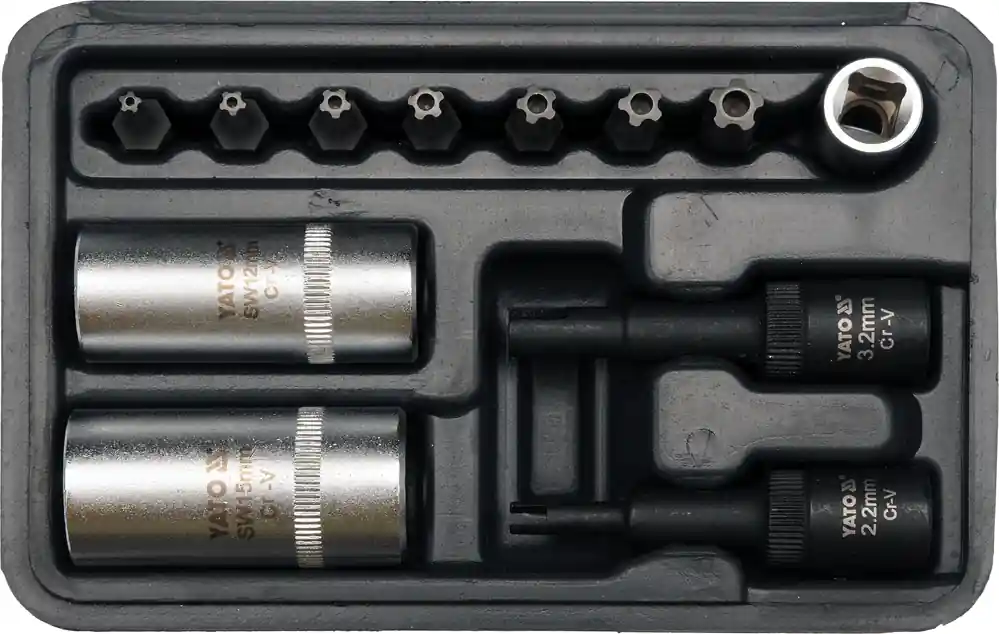 Set de chei pentru instalatiile de aer condiționat format din 12 piese, fabricate din oțel CrV (tubularele, chei și adaptor) și otel S2 (biți), folosit în servicii auto, servicii de climatizare auto.