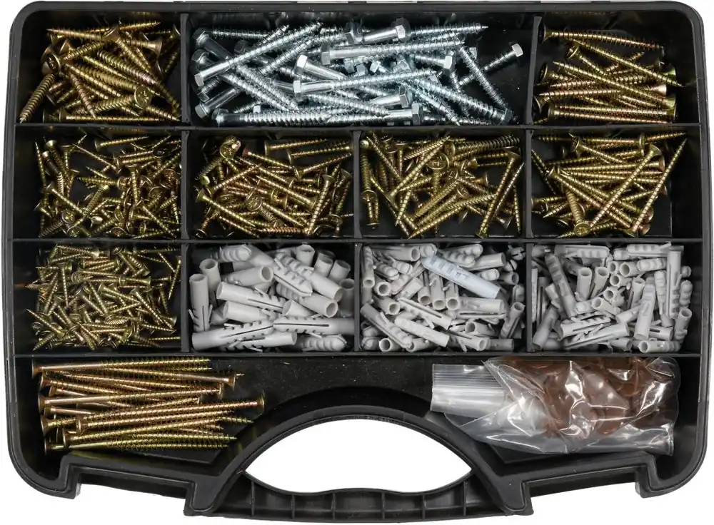 Set de șuruburi și dibluri YT-36500. Fabricat din materiale de înaltă calitate. O gamă largă de dimensiuni asigură selectarea elementelor potrivite pentru lucrarea facuta, metoda de atașare și suprafață. Amplasat în cutii cu compartimente care facilitează selectarea.