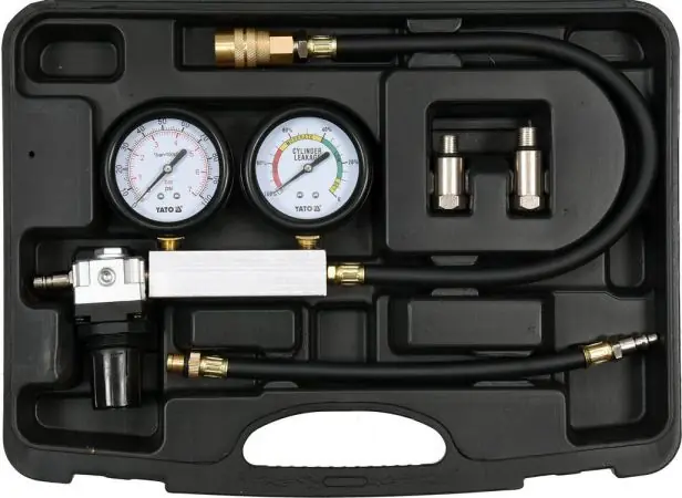 Testerul de scurgere a cilindrilor pentru motoarele pe benzină vă permite să diagnosticați rapid și ușor scurgerile din camera de ardere. Vă permite să testați gradul de uzură al motoruluiprin alimentarea cu aer comprimat a cilindrului și determinarea procentului de cădere de presiune cauzată de scurgerile cilindrului. Detectează, printre altele deteriorarea inelului pistonului, deteriorarea supapei de admisie sau evacuare, deteriorarea garniturii chiulasei.